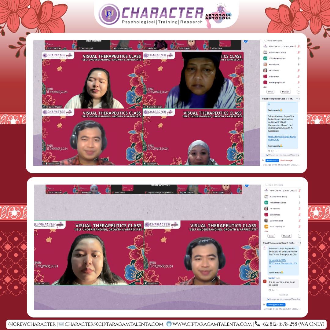 ARTOSOUL CHARACTER CLUB Telah sukses melaksanakan Visual Therapeutics Class kedua dengan bahasan “Self Understanding, Growth, & Appreciate” pada Rabu, 11 Desember 2024 dengan Narasumber kita Alif Sukma Muclisin, S.Pd., M.Pd., CTRS dan Daisy Prawitasari Poegoeh, M.Si Psikolog.